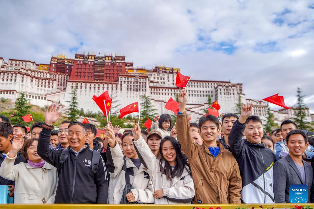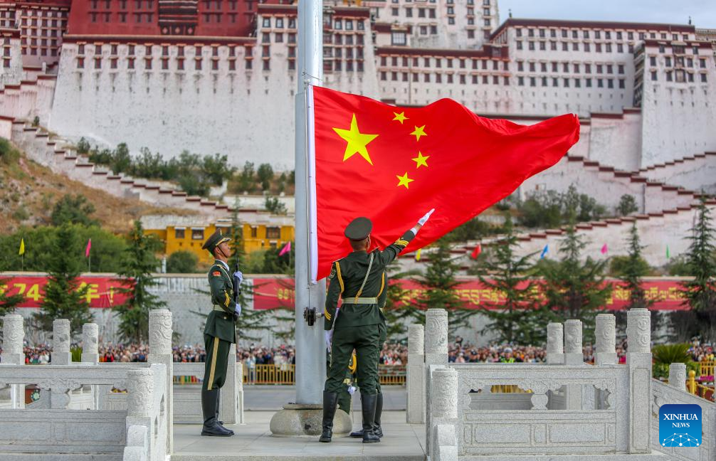 A flag-raising ceremony to celebrate the 74th anniversary of the founding of the People's Republic of China is held at the Potala Palace square in Lhasa, capital of southwest China's Tibet Autonomous Region, Oct. 1, 2023. (Xinhua/Shao Zedong)