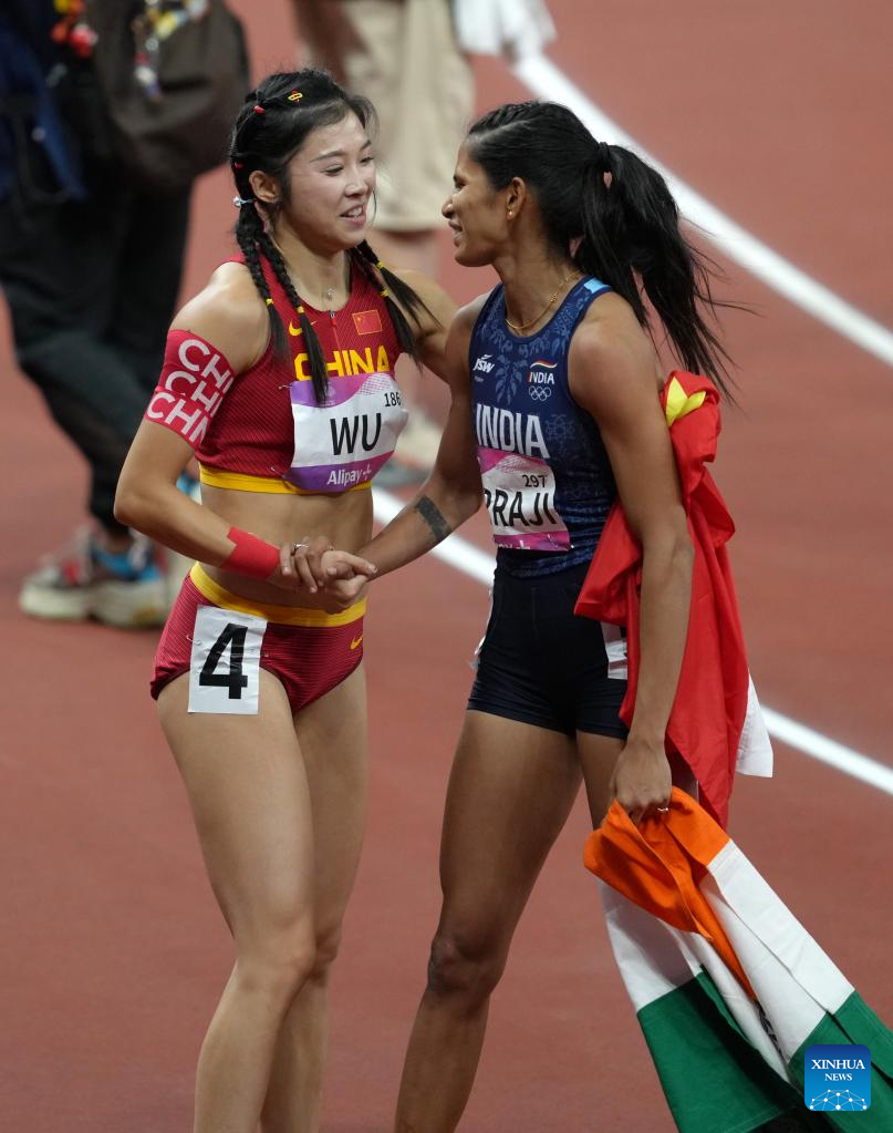 Wu Yanni (L) of China greets Jyothi Yarraji of India after the Women's 100m Hurdles Final of Athletics at the 19th Asian Games in Hangzhou, east China's Zhejiang Province, Oct. 1, 2023. (Xinhua/Jiang Wenyao)
