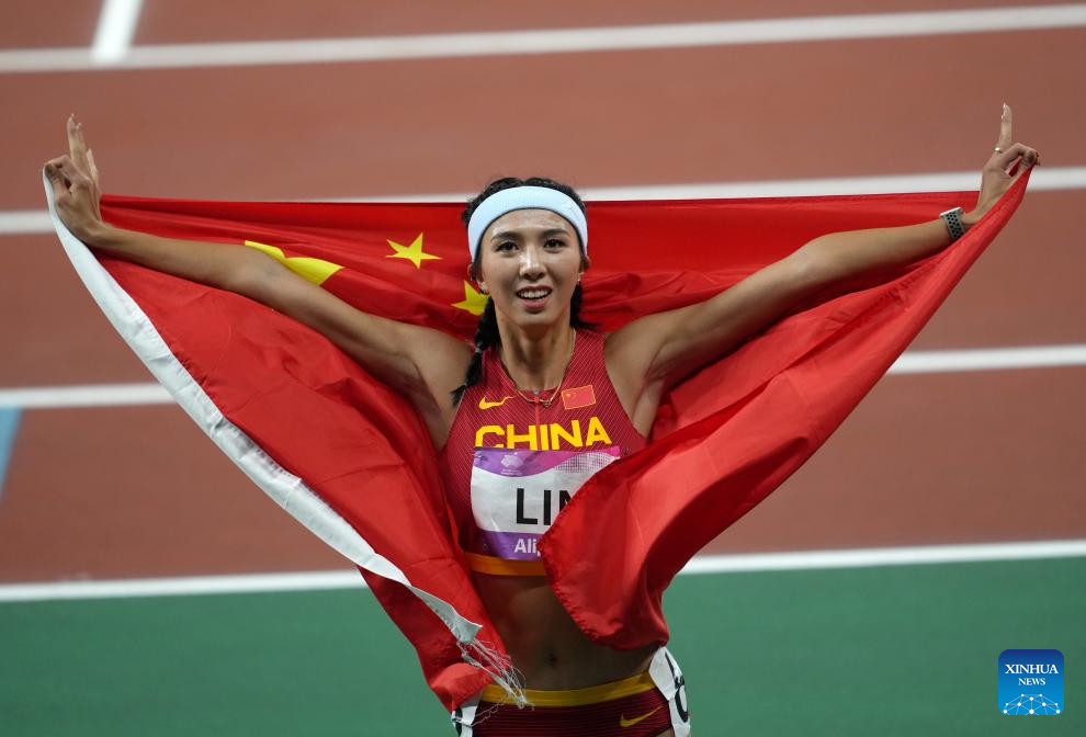 Lin Yuwei of China celebrates after the Women's 100m Hurdles Final of Athletics at the 19th Asian Games in Hangzhou, east China's Zhejiang Province, Oct. 1, 2023. (Xinhua/Li Yibo)