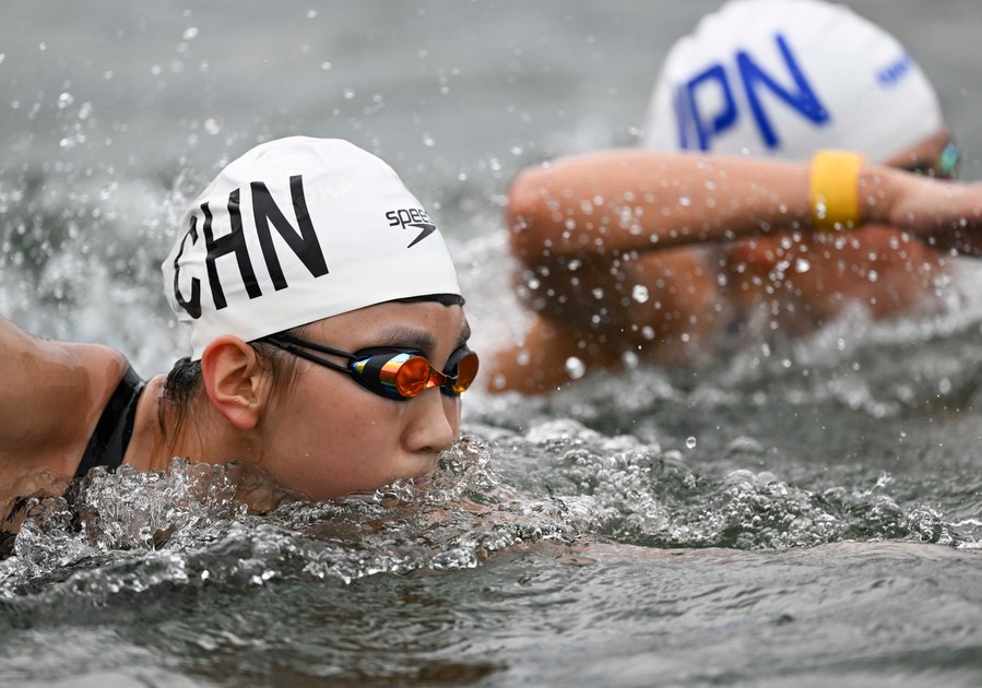 Wu Shutong (front) of China competes in the women's 10km of marathon swimming. (Xinhua/Hu Huhu)