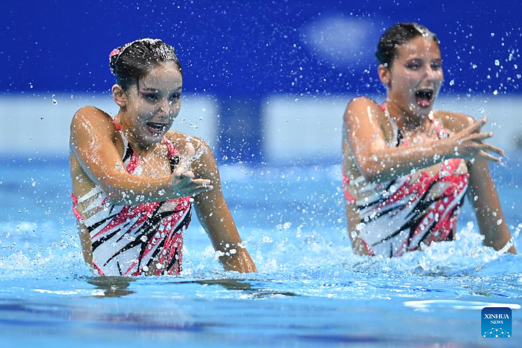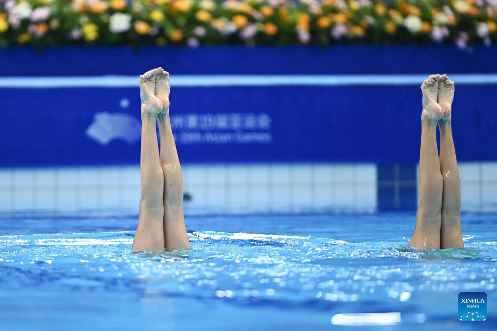 Diana Onkes/Ziyodakhon Toshkhujaeva of Uzbekistan compete during the Duet Technical Routine of Artistic Swimming at the 19th Asian Games in Hangzhou, east China's Zhejiang Province, Oct. 6, 2023. (Xinhua/Huang Zongzhi)