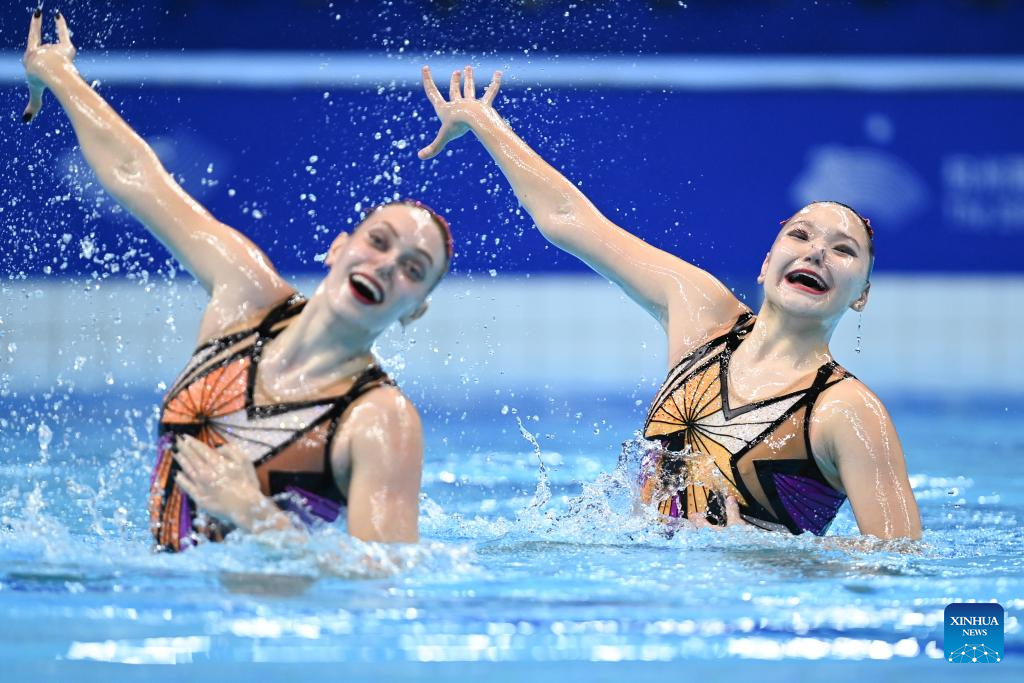 Arina Pushkina/Yasmin Tuyakova of Kazakhstan compete during the Duet Technical Routine of Artistic Swimming at the 19th Asian Games in Hangzhou, east China's Zhejiang Province, Oct. 6, 2023. (Xinhua/Huang Zongzhi)