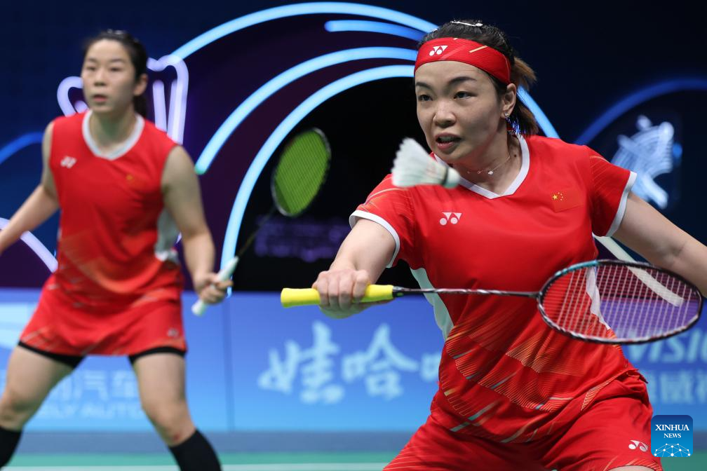 Chen Qingchen (R)/Jia Yifan of China compete during the Women's Doubles Semifinal of Badminton between Chen Qingchen/Jia Yifan of China and Kim Soyeong/Kong Heeyong of South Korea at the 19th Asian Games in Hangzhou, east China's Zhejiang Province, Oct. 6, 2023. (Xinhua/Chen Bin)