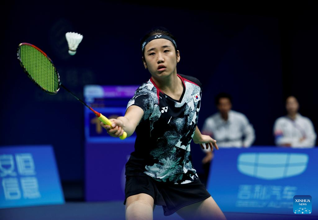An Seyoung of South Korea competes against He Bingjiao of China during the Women's Singles Semifinal of Badminton at the 19th Asian Games in Hangzhou, east China's Zhejiang Province, Oct. 6, 2023. (Xinhua/Ren Zhenglai)
