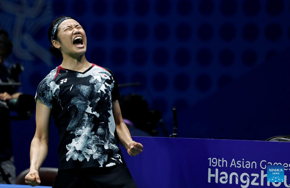 An Seyoung of South Korea celebrates defeating He Bingjiao of China after the Women's Singles Semifinal of Badminton at the 19th Asian Games in Hangzhou, east China's Zhejiang Province, Oct. 6, 2023. (Xinhua/Ren Zhenglai)