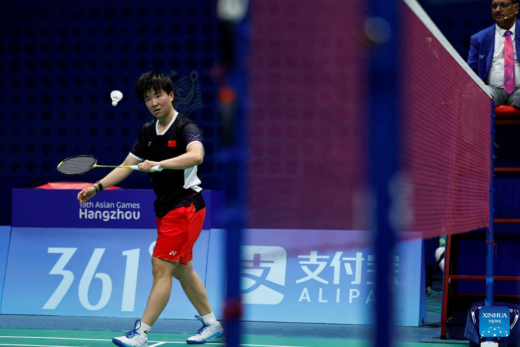 He Bingjiao of China competes against An Seyoung of South Korea during the Women's Singles Semifinal of Badminton at the 19th Asian Games in Hangzhou, east China's Zhejiang Province, Oct. 6, 2023. (Xinhua/Chen Bin)