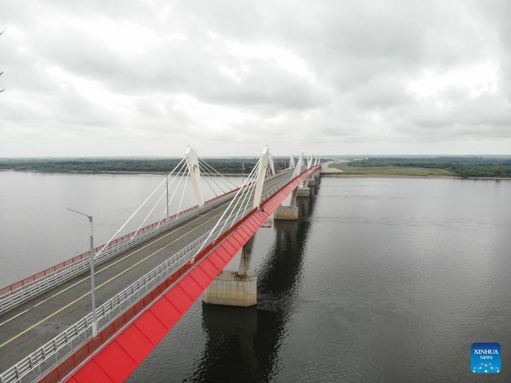 This aerial photo taken on Aug. 11, 2023 shows the Heihe-Blagoveshchensk cross-border highway bridge at the border of China and Russia. In June last year, the Heihe-Blagoveshchensk cross-border highway bridge over Heilongjiang River opened to traffic. (Xinhua/Wang Song)