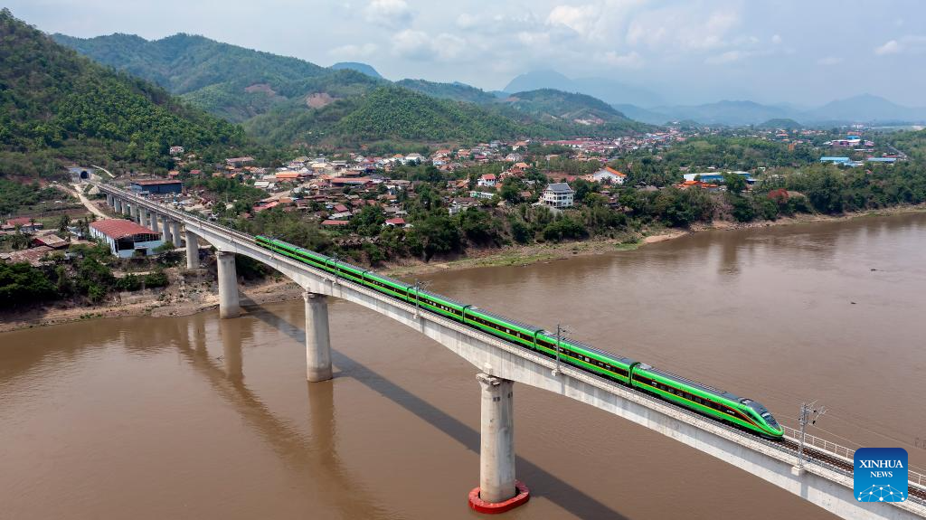 A train drives on the China-Laos Railway's Luang Prabang cross-Mekong River super major bridge in Laos, May 28, 2023. The bridge, some 230 km north of Lao capital Vientiane, has a total length of 1,458.9 meters and is composed of 28 span T-beams and six spans continuous beams. It is the most difficult and most technically complex bridge on the entire railway. (Photo by Chen Chang/Xinhua)