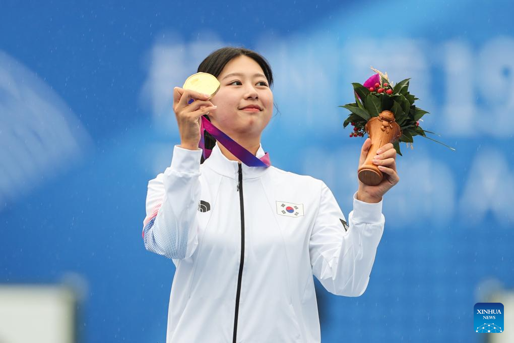Gold medalist Lim Sihyeon of South Korea attends the awarding ceremony for the Recurve Women's Individual of Archery at the 19th Asian Games in Hangzhou, east China's Zhejiang Province, Oct. 7, 2023. (Xinhua/Shan Yuqi)