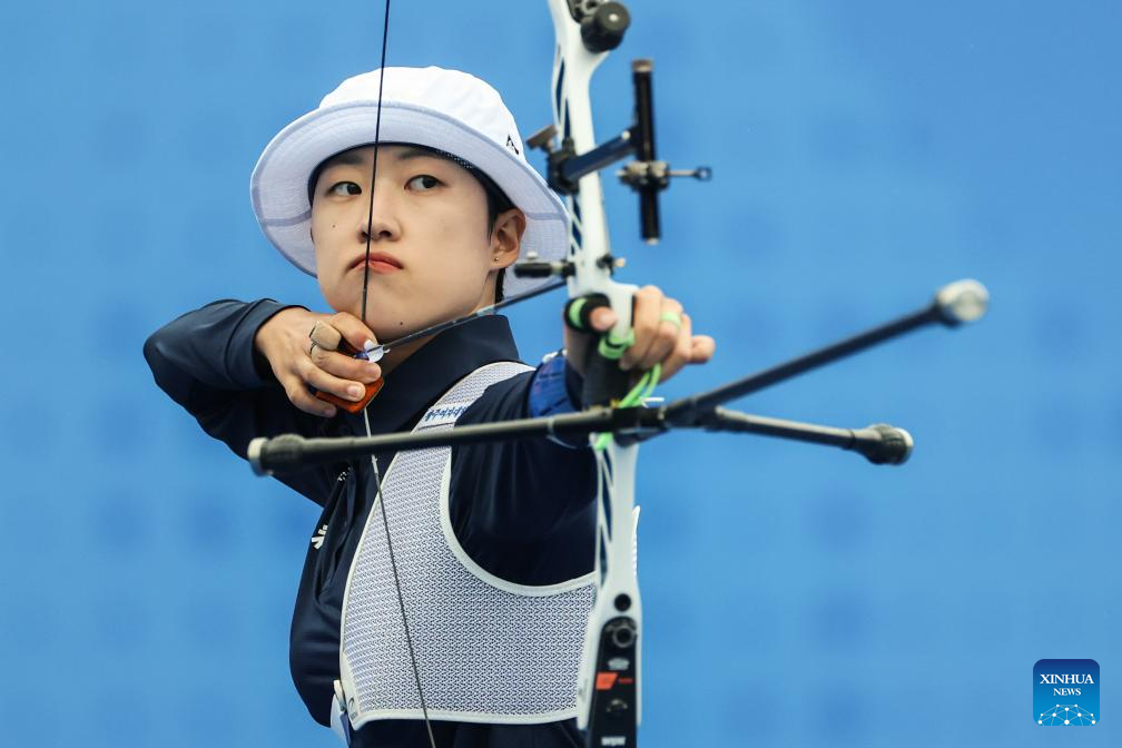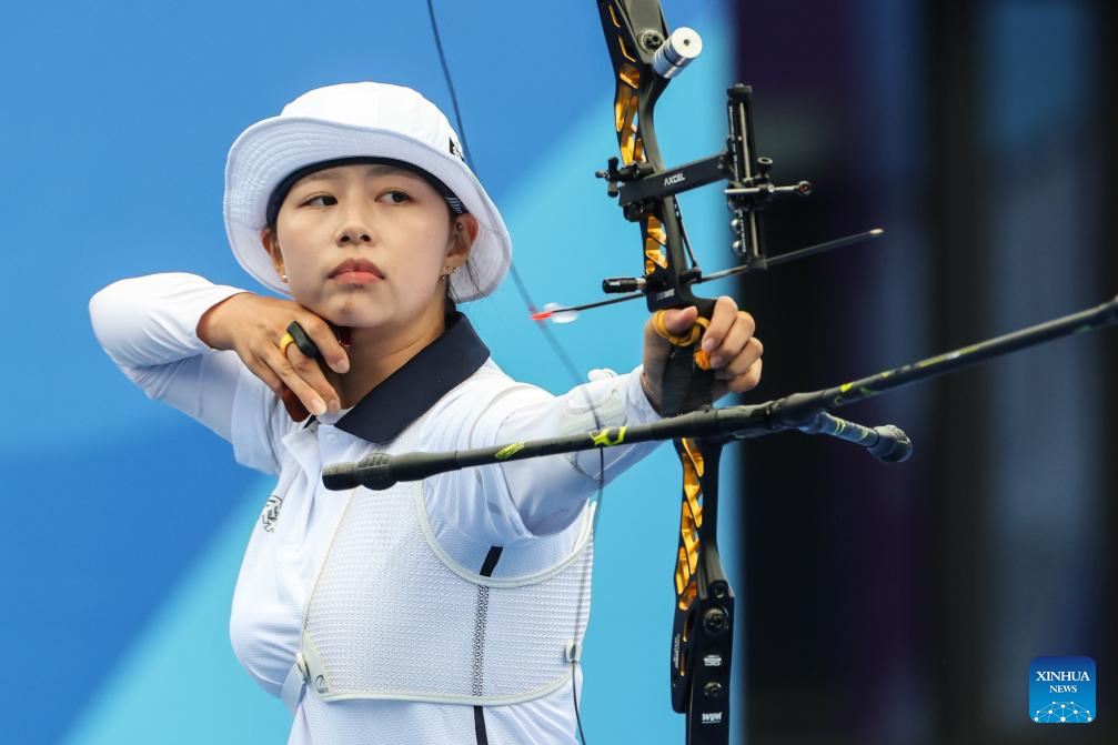 Lim Sihyeon of South Korea competes during the Recurve Women's Individual Gold Medal Match of Archery at the 19th Asian Games in Hangzhou, east China's Zhejiang Province, Oct. 7, 2023. (Xinhua/Shan Yuqi)