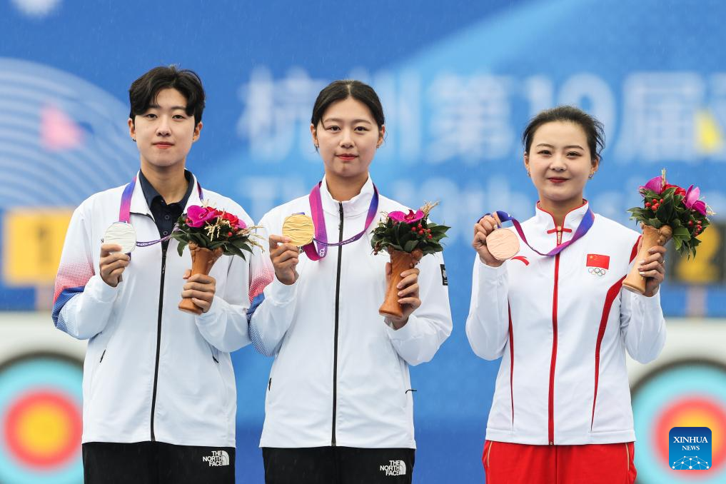 Gold medalist Lim Sihyeon (C), silver medalist An San (L) of South Korea and bronze medalist Li Jiaman of China attend the awarding ceremony for the Recurve Women's Individual of Archery at the 19th Asian Games in Hangzhou, east China's Zhejiang Province, Oct. 7, 2023. (Xinhua/Shan Yuqi)