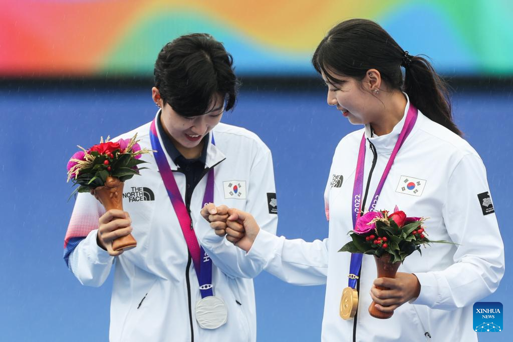 Gold medalist Lim Sihyeon (R) and silver medalist An San (L) of South Korea celebrate during the awarding ceremony for the Recurve Women's Individual of Archery at the 19th Asian Games in Hangzhou, east China's Zhejiang Province, Oct. 7, 2023. (Xinhua/Shan Yuqi)