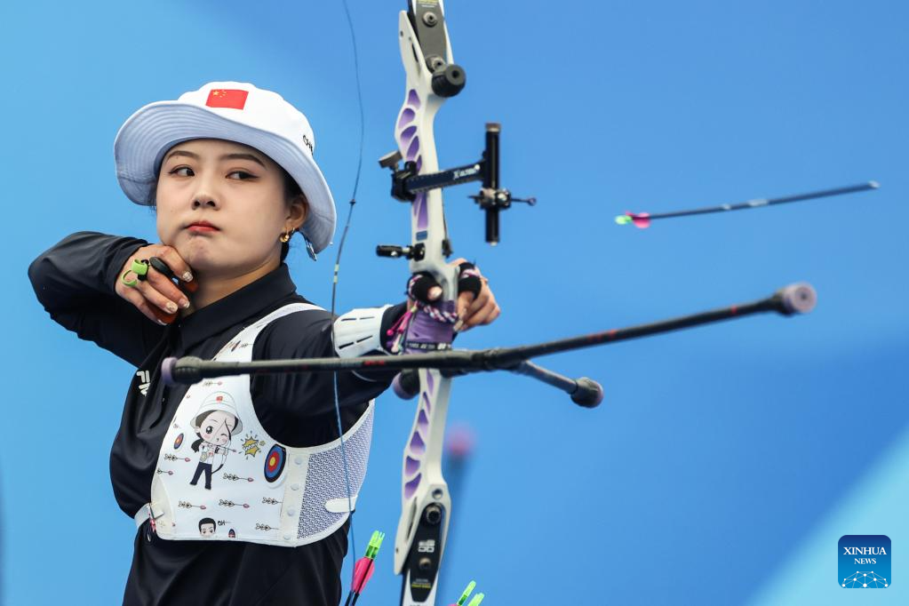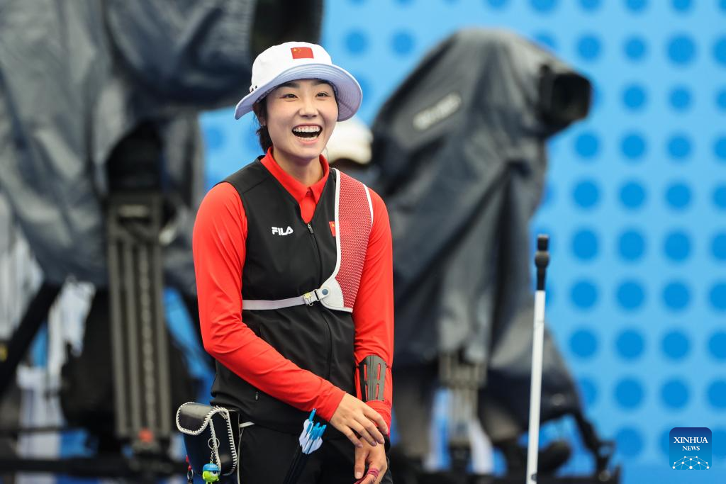 Hailigan of China reacts during the Recurve Women's Individual Bronze Medal Match of Archery at the 19th Asian Games in Hangzhou, east China's Zhejiang Province, Oct. 7, 2023. (Xinhua/Shan Yuqi)