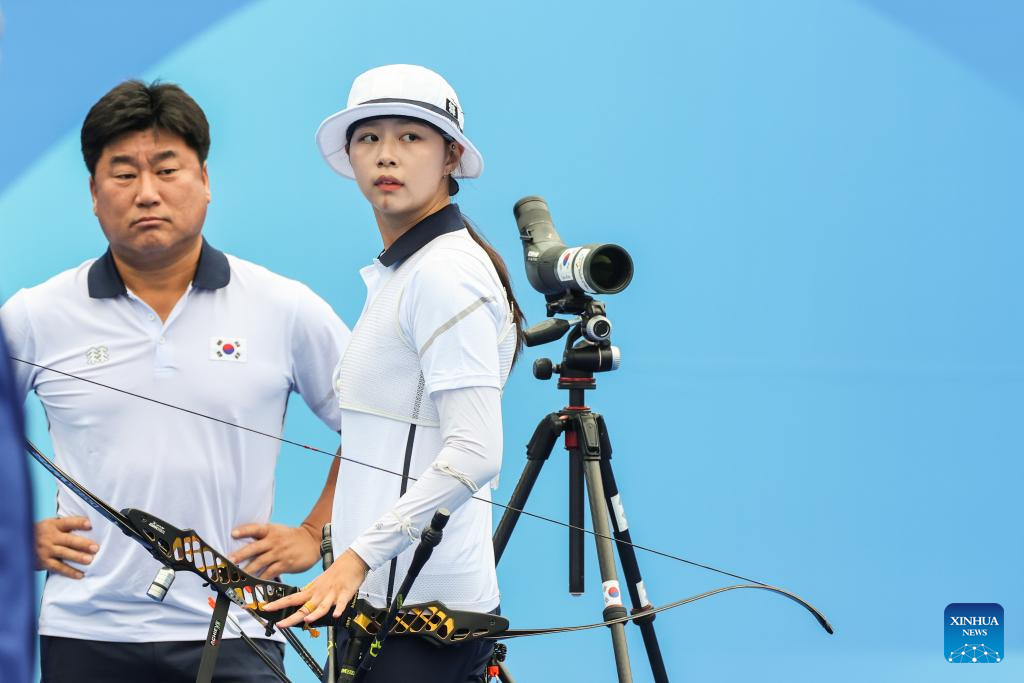 Lim Sihyeon (R) of South Korea is seen during the Recurve Women's Individual Gold Medal Match of Archery at the 19th Asian Games in Hangzhou, east China's Zhejiang Province, Oct. 7, 2023. (Xinhua/Shan Yuqi)
