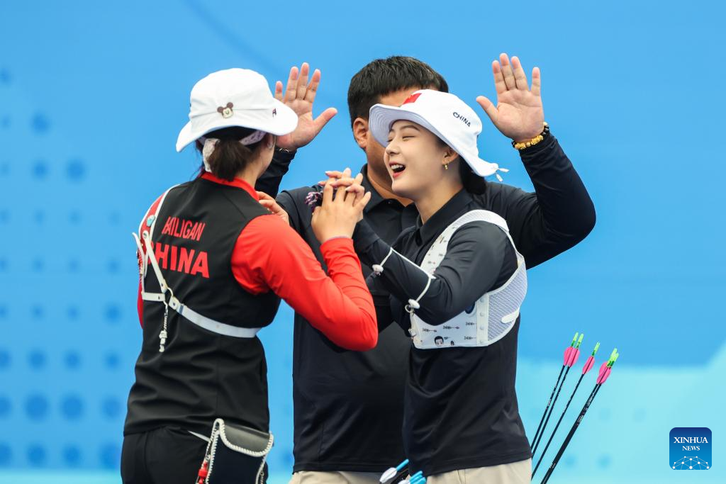 Hailigan (L) and Li Jiaman of China react after the Recurve Women's Individual Bronze Medal Match of Archery at the 19th Asian Games in Hangzhou, east China's Zhejiang Province, Oct. 7, 2023. (Xinhua/Shan Yuqi)