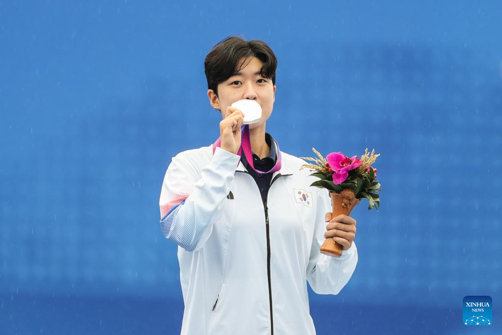 Silver medalist An San of South Korea attends the awarding ceremony for the Recurve Women's Individual of Archery at the 19th Asian Games in Hangzhou, east China's Zhejiang Province, Oct. 7, 2023. (Xinhua/Shan Yuqi)