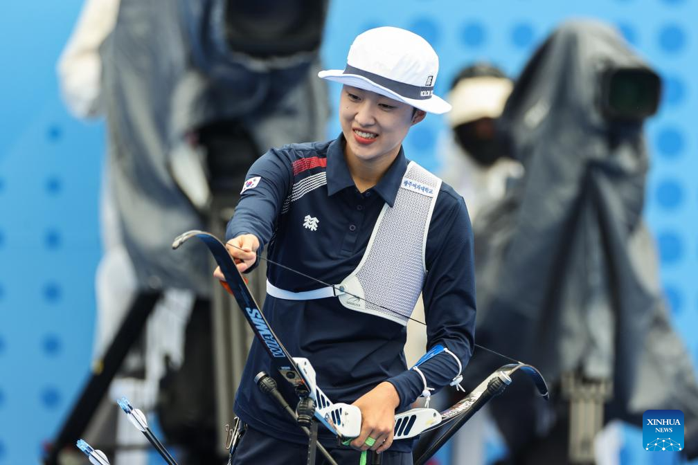 An San of South Korea competes during the Recurve Women's Individual Gold Medal Match of Archery at the 19th Asian Games in Hangzhou, east China's Zhejiang Province, Oct. 7, 2023. (Xinhua/Shan Yuqi)
