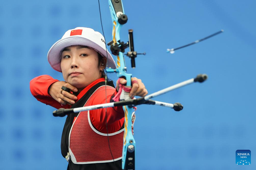 Li Jiaman of China competes during the Recurve Women's Individual Bronze Medal Match of Archery at the 19th Asian Games in Hangzhou, east China's Zhejiang Province, Oct. 7, 2023. (Xinhua/Shan Yuqi)