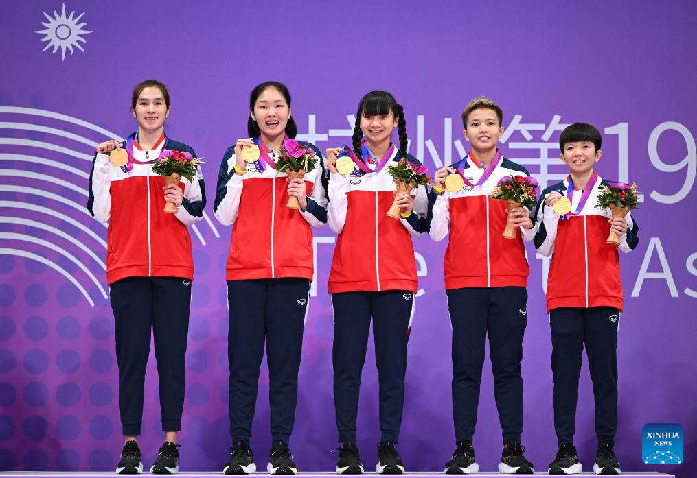 Gold medalists team Thailand attend the awarding ceremony of the Women's Regu of Sepaktakraw at the 19th Asian Games in Jinhua, east China's Zhejiang Province, Oct. 7, 2023. (Xinhua/Chen Zhonghao)