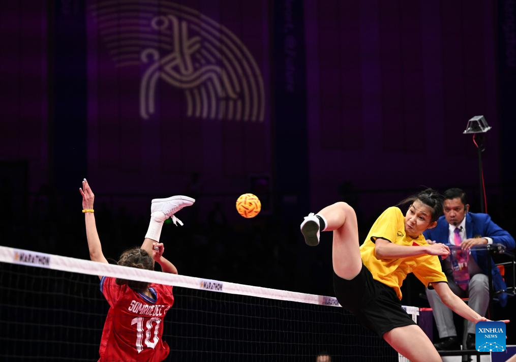 Somruedee Pruepruk (bottom) of Thailand competes during the Women's Regu Gold Medal Match of Sepaktakraw between Thailand and Vietnam at the 19th Asian Games in Jinhua, east China's Zhejiang Province, Oct. 7, 2023. (Xinhua/Chen Zhonghao)