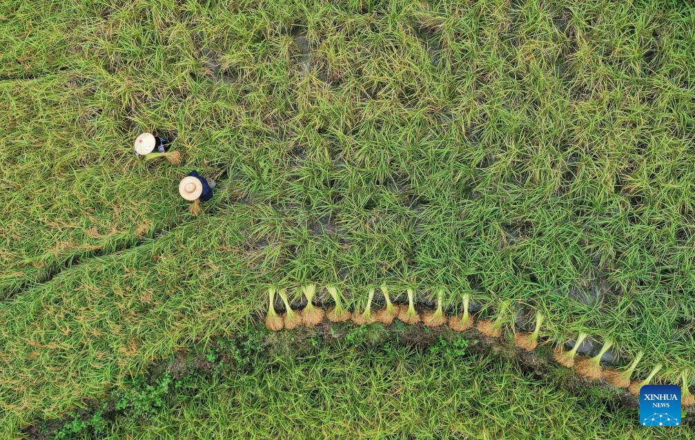 In this aerial photo, farmers harvest rice at a paddy field in Tengchong, southwest China's Yunnan Province, Oct. 7, 2023. (Photo by Gong Zujin/Xinhua)