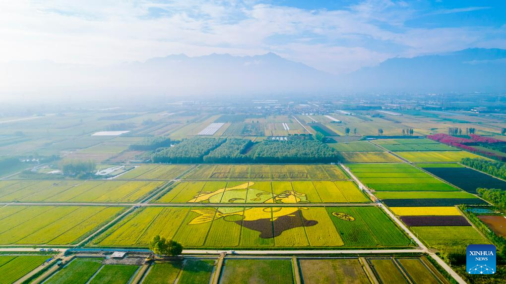 This aerial photo taken on Oct. 7, 2023 shows a paddy field painting in Qubao Village, Xi'an, northwest China's Shaanxi Province. (Photo by Dong Xiwei/Xinhua)