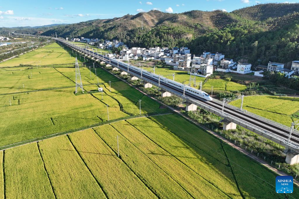 In this aerial photo, a high-speed train runs past paddy fields in Longchuan Township, Nanhua County, Chuxiong Yi Autonomous Prefecture, southwest China's Yunnan Province, Oct. 5, 2023. (Photo by Xia Tianyu/Xinhua)