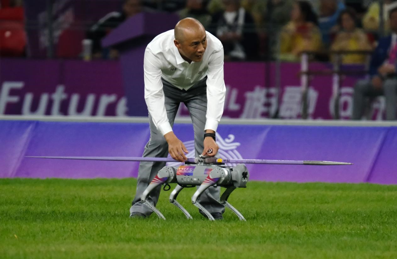 A "robot dog" transports a javelin during a javelin competition of the Hangzhou Asian Games, Oct. 3, 2023. (People's Daily Online/Wu Huang)