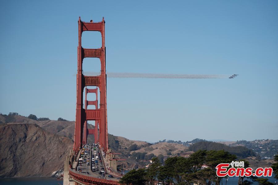 The US Navy Blue Angels fly over the Golden Gate Bridge during the Fleet Week air show in San Francisco, California, U.S., Oct. 6, 2023. (Photo: China News Service/Liu Guanguan)