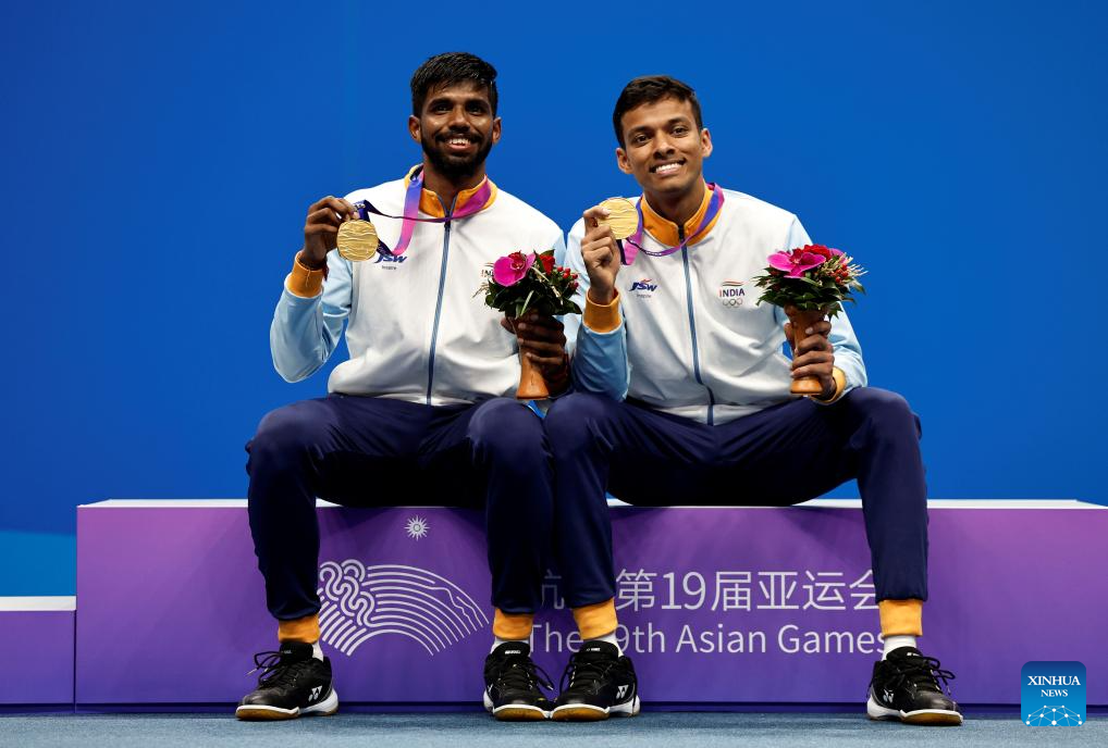 Gold medalists Satwik Sairaj Rankireddy (L) /Chirag Chandrashekhar Shetty of India attend the awarding ceremony for the Men's Doubles of Badminton at the 19th Asian Games in Hangzhou, east China's Zhejiang Province, Oct. 7, 2023. (Xinhua/Ren Zhenglai)