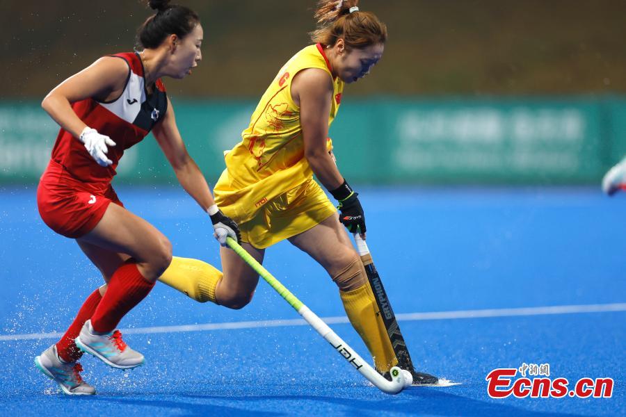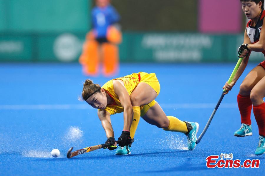 Players compete during the 19th Asian Games women's hockey gold medal match at Gongshu Canal Sports Park Stadium in Hangzhou, east China's Zhejiang Province, Oct. 7, 2023. (Photo: China News Service/Fu Tian)
