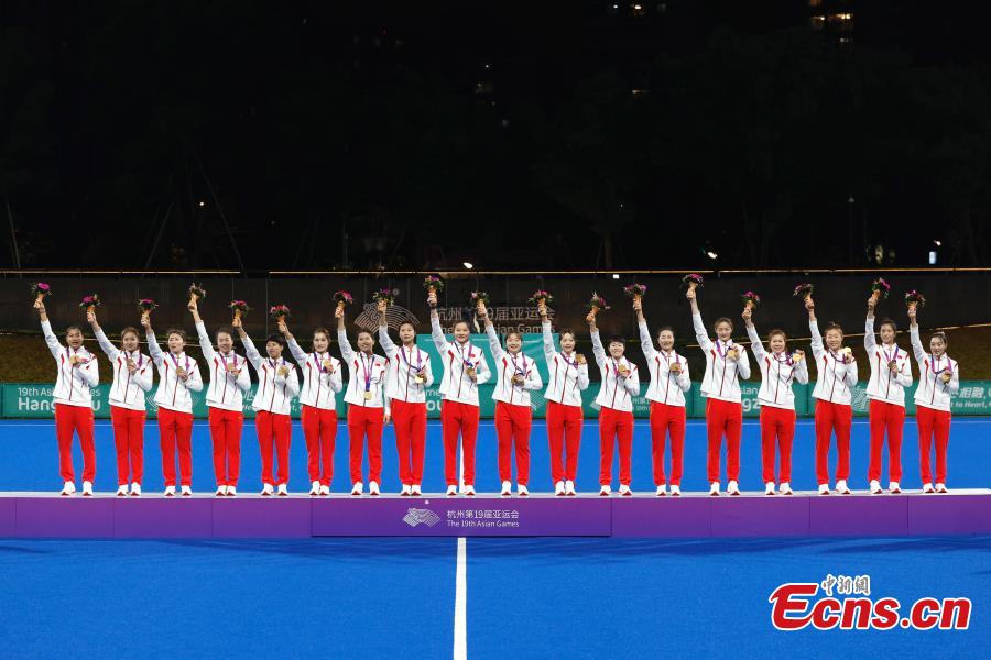 Team members of Chinese women's hockey attend the awarding ceremony after winning the women's hockey gold medal at the 19th Asian Games at Gongshu Canal Sports Park Stadium in Hangzhou, east China's Zhejiang Province, Oct. 7, 2023. (Photo: China News Service/Fu Tian)