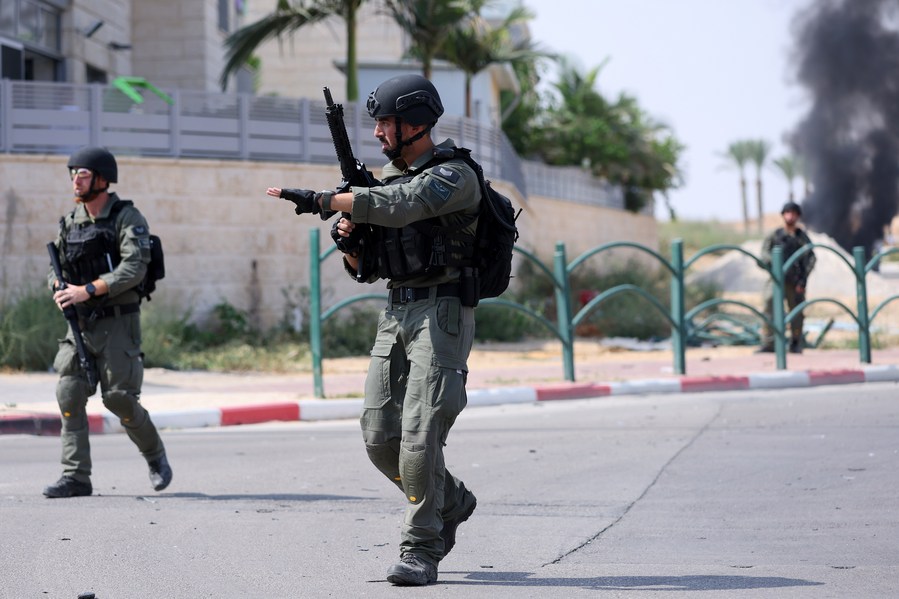 This photo taken on Oct. 8, 2023 shows Israeli soldiers at the southern Israeli town of Ofakim. (Ilan Assayag/JINI via Xinhua)