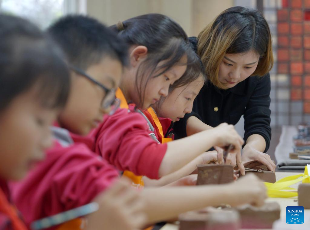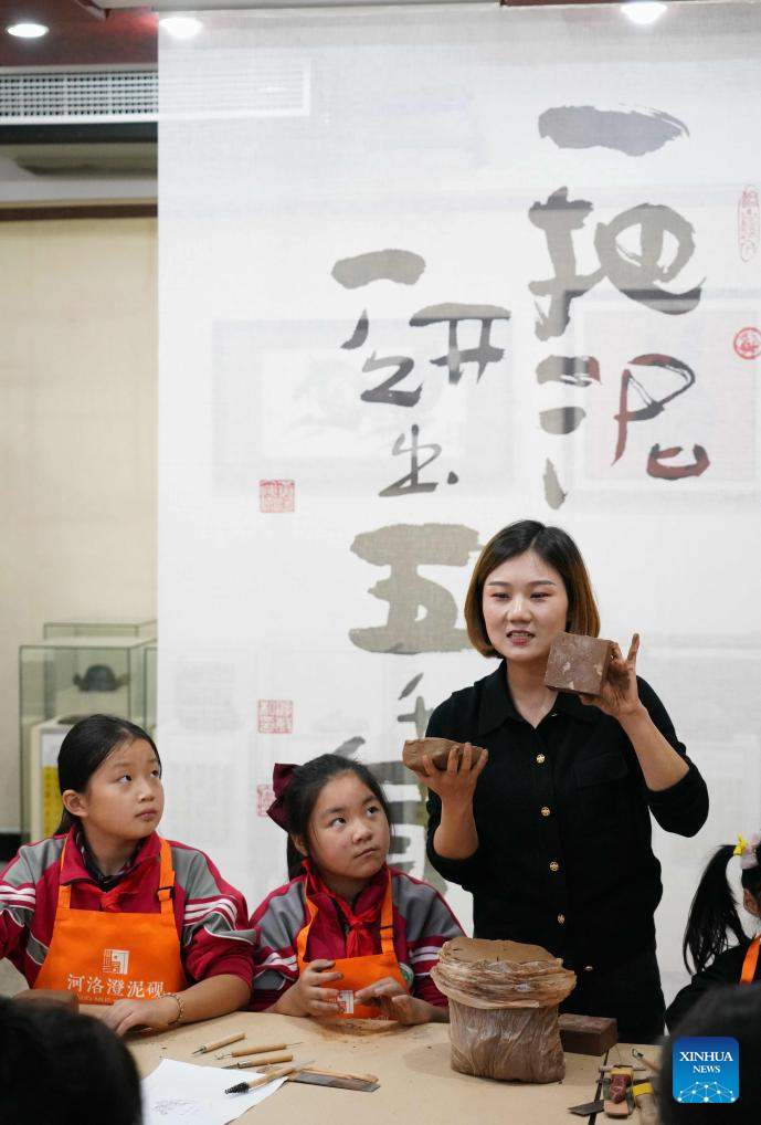 You Xiaoxiao teaches students to shape the mud at a Chengni inkstone art museum in Xin'an County, central China's Henan Province, Oct. 7, 2023. (Xinhua/Xing Guangli)