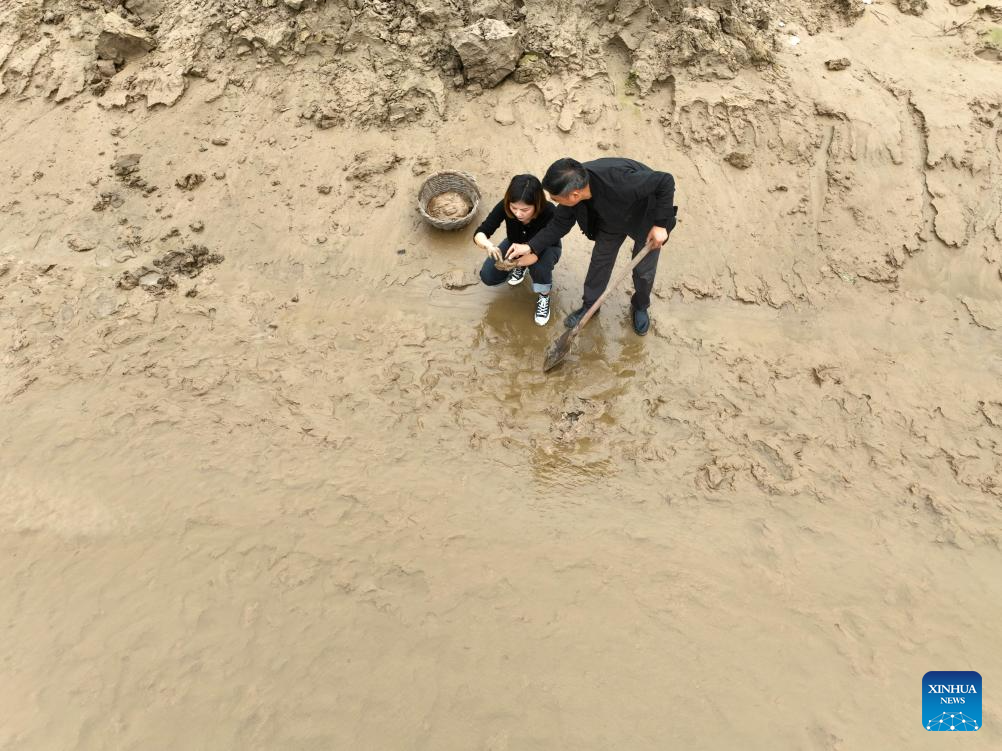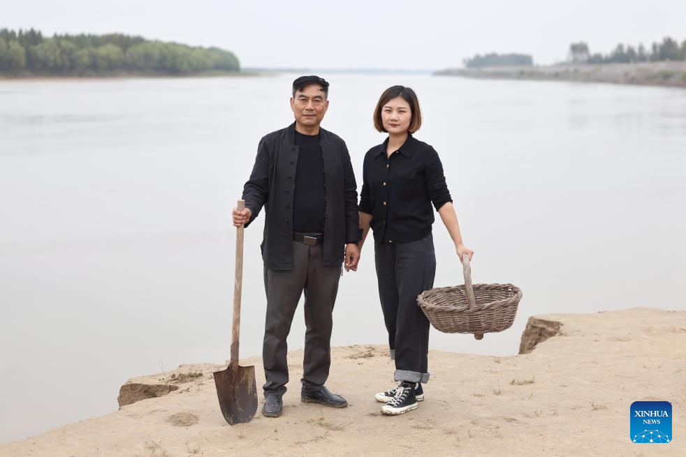 You Xiaoxiao (L) and her father check the mud at the Luoyang section of Yellow River, central China's Henan Province, Oct. 7, 2023. (Xinhua/Hao Yuan)