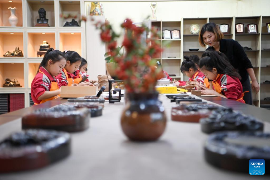 You Xiaoxiao teaches students to make Chengni inkstone at a Chengni inkstone art museum in Xin'an County, central China's Henan Province, Oct. 7, 2023. (Xinhua/Hao Yuan)
