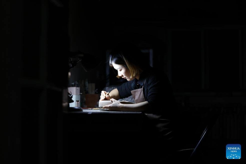 You Xiaoxiao carves on an inkstone blank at a studio in Xin'an County, central China's Henan Province, Oct. 7, 2023. (Xinhua/Xing Guangli)
