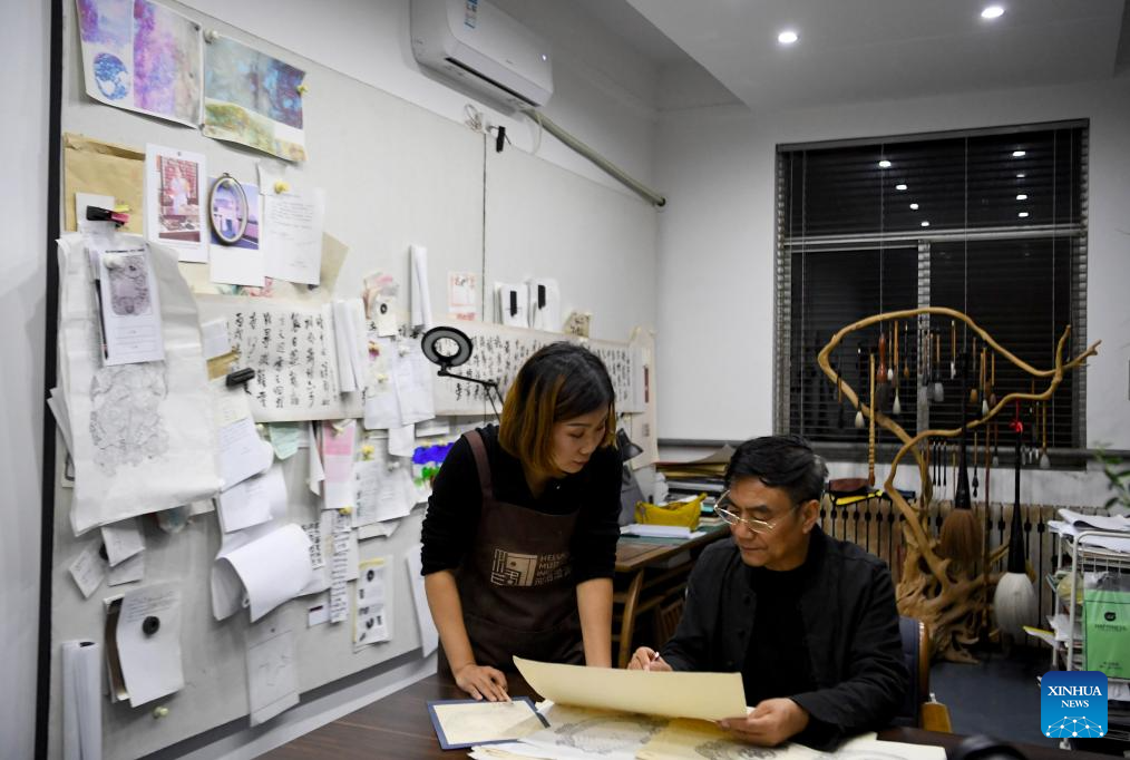 You Xiaoxiao (L) and her father talk at a studio in Xin'an County, central China's Henan Province, Oct. 7, 2023. (Xinhua/Hao Yuan)