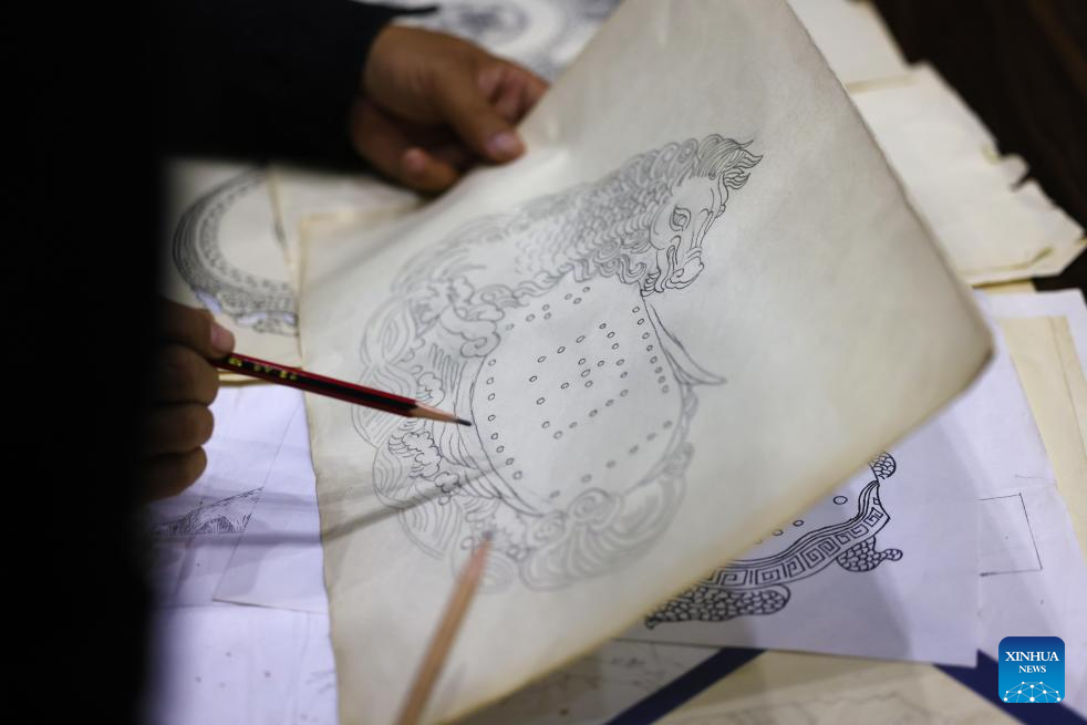 You Xiaoxiao drafts an inkstone design at a studio in Xin'an County, central China's Henan Province, Oct. 7, 2023. (Xinhua/Xing Guangli)