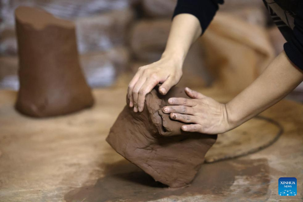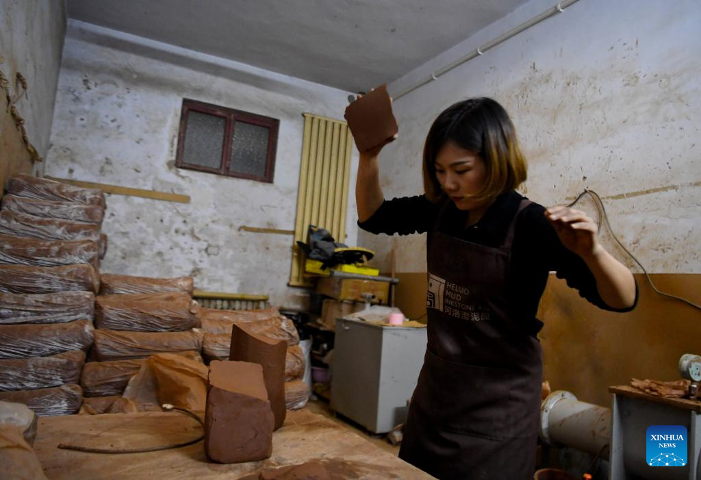 You Xiaoxiao processes the mud for inkstone making in Xin'an County, central China's Henan Province, Oct. 7, 2023. (Xinhua/Hao Yuan)
