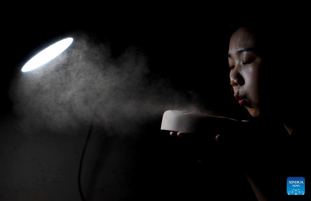 You Xiaoxiao blows the dust off an inkstone blank in Xin'an County, central China's Henan Province, Oct. 7, 2023. (Xinhua/Hao Yuan)