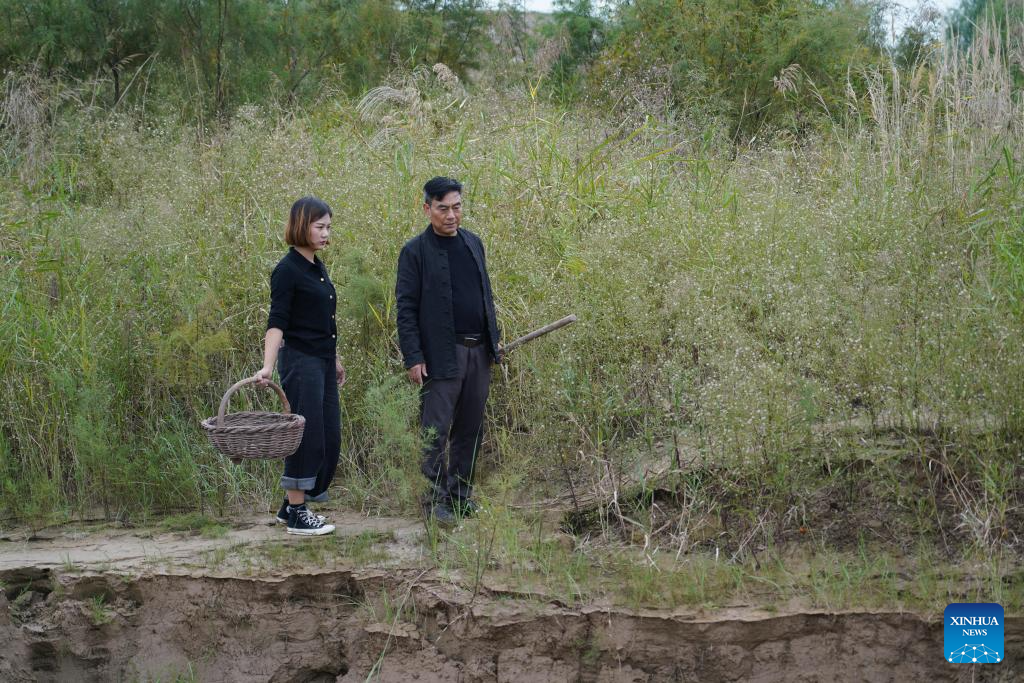 You Xiaoxiao (L) and her father walk to collect the mud at the Luoyang section of Yellow River, central China's Henan Province, Oct. 7, 2023. (Xinhua/Wang Jingyi)