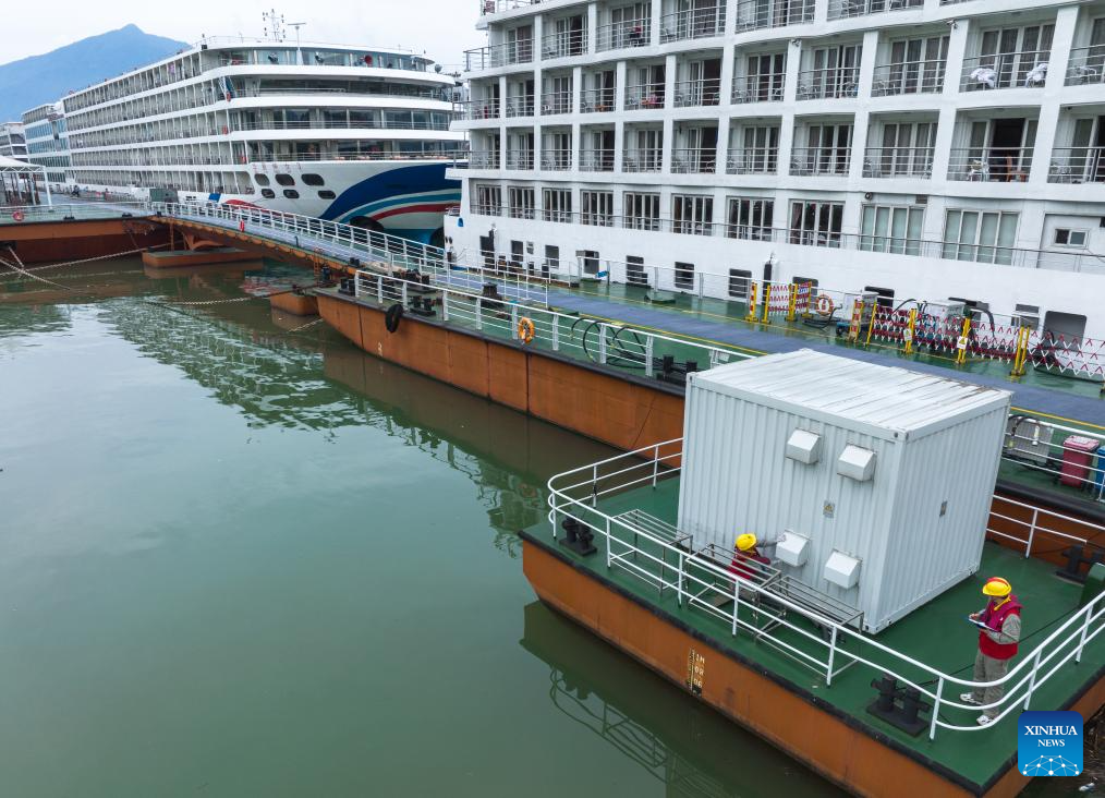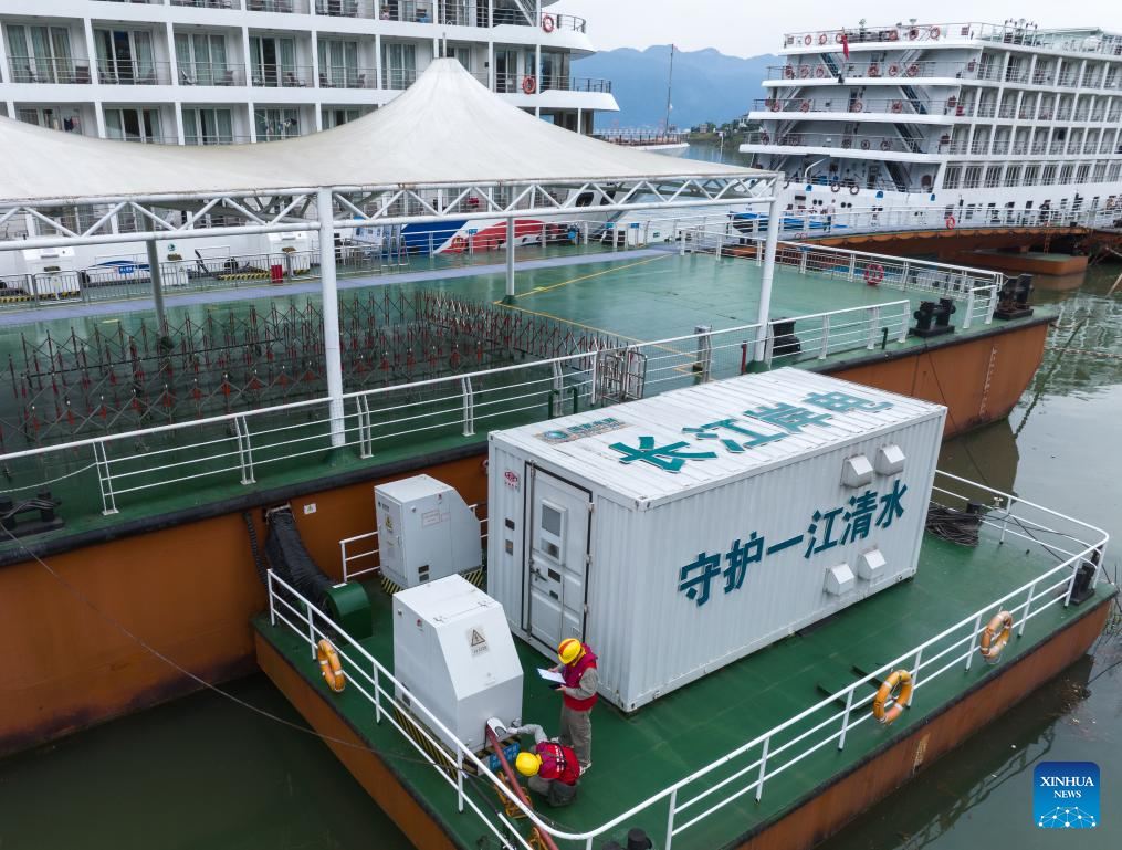 This aerial photo taken on Oct. 9, 2023 shows shore power maintenance staff members with the State Grid Yichang Power Supply Company inspecting shore power facilities at Zigui port in Yichang City, central China's Hubei Province. Since 2015, Yichang has been active in constructing shore power facilities. To date, 168 sets of shore power facilities with a capacity of 27,000 kilovolt-amperes have been installed, covering 67 docks on the Yichang section of the Yangtze River. (Xinhua/Xiao Yijiu)