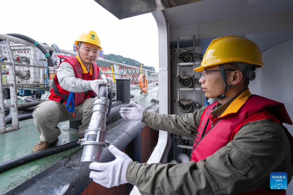 Shore power maintenance staff members with the State Grid Yichang Power Supply Company inspect shore power facilities on a boat at Zigui port in Yichang City, central China's Hubei Province, Oct. 9, 2023. Since 2015, Yichang has been active in constructing shore power facilities. To date, 168 sets of shore power facilities with a capacity of 27,000 kilovolt-amperes have been installed, covering 67 docks on the Yichang section of the Yangtze River. (Xinhua/Xiao Yijiu)