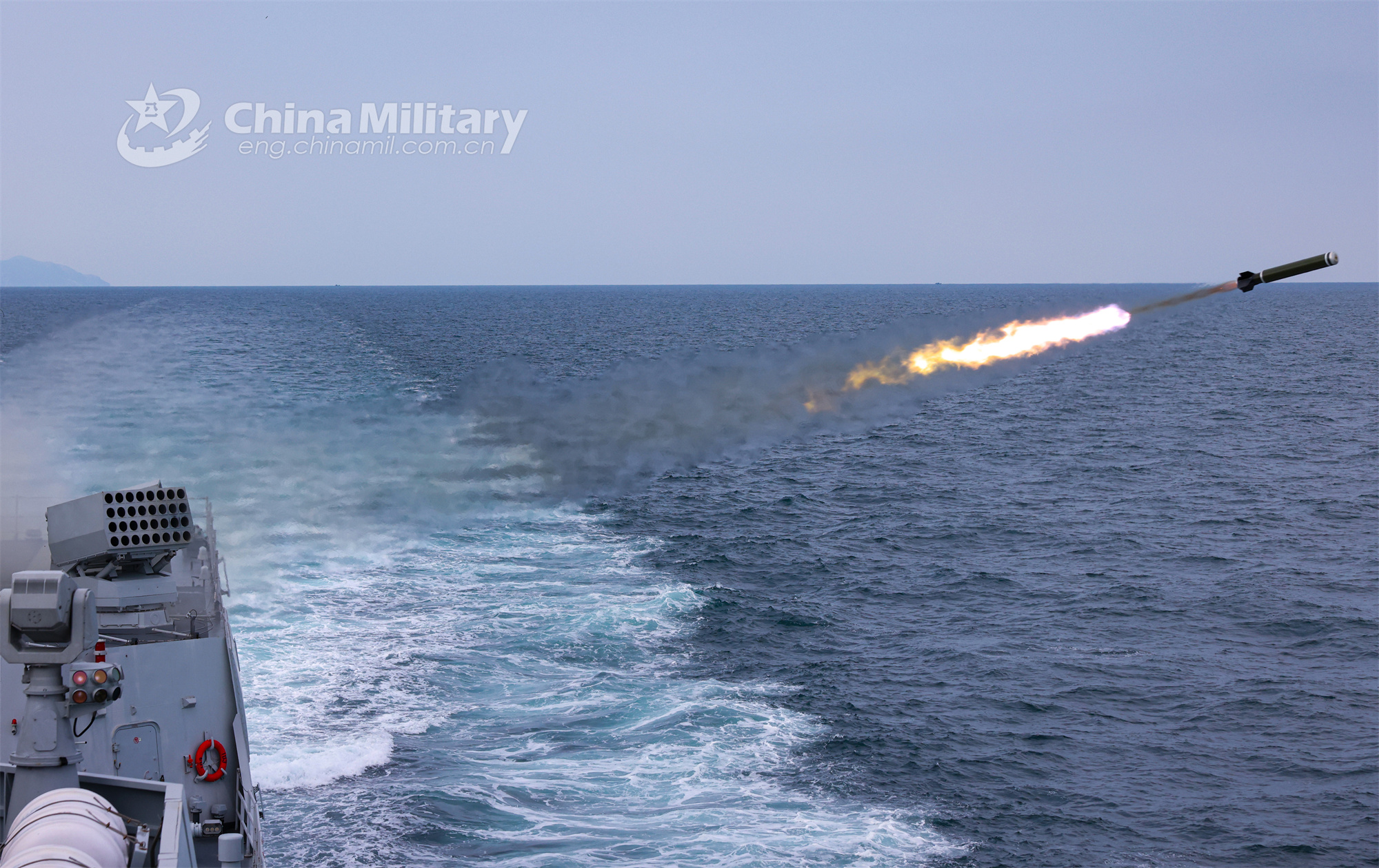 The guided-missile destroyer Anshan attached to a destroyer flotilla with the navy under the PLA Northern Theater Command fires a jamming shell during a maritime training exercise on September 20, 2023. (eng.chinamil.com.cn/Photo by Wang Zezhou)