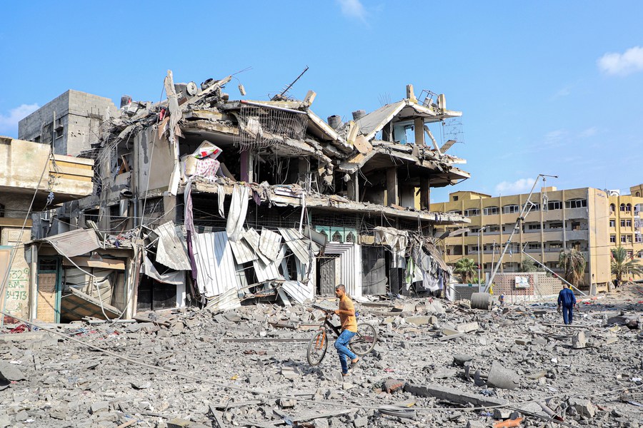 People walk past destroyed buildings following an Israeli airstrike in Gaza City, on Oct. 10, 2023. (Photo by Rizek Abdeljawad/Xinhua)
