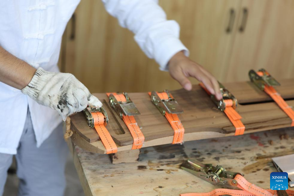 Guqin maker Xu Bing makes Guqin at Lankao County of Kaifeng City, central China's Henan Province, Oct. 9, 2023. (Xinhua/Li Jianan)