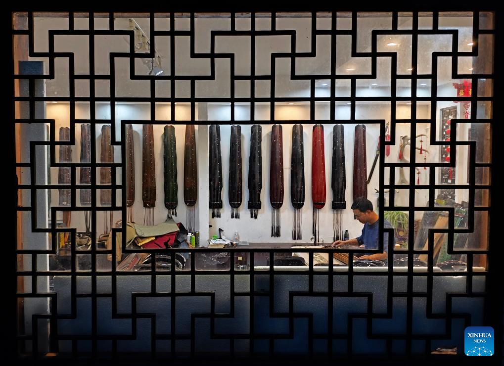 Guqin maker Xu Yachong tunes the Guqin at Lankao County of Kaifeng City, central China's Henan Province, Oct. 9, 2023. (Xinhua/Xing Guangli)