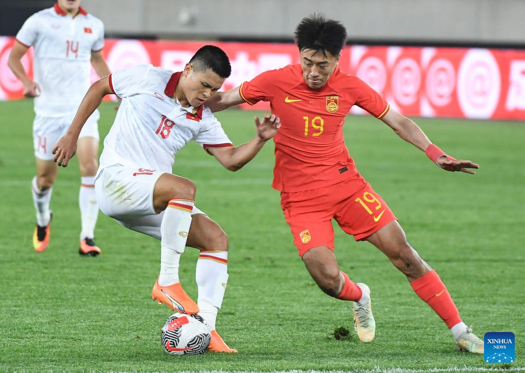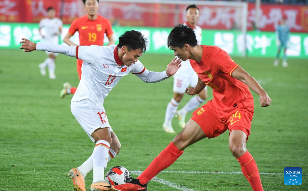 Ho Van Cuong (L) of Vietnam breaks through during an international friendly football match between China and Vietnam in Dalian, northeast China's Liaoning Province, Oct. 10, 2023. (Xinhua/Long Lei)