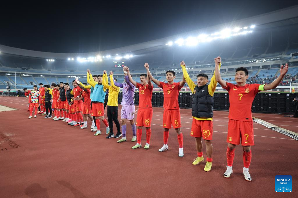Players of China celebrate winning after an international friendly football match between China and Vietnam in Dalian, northeast China's Liaoning Province, Oct. 10, 2023. (Xinhua/Long Lei)